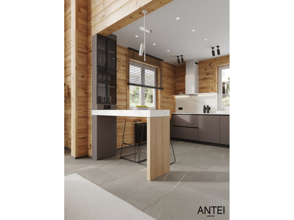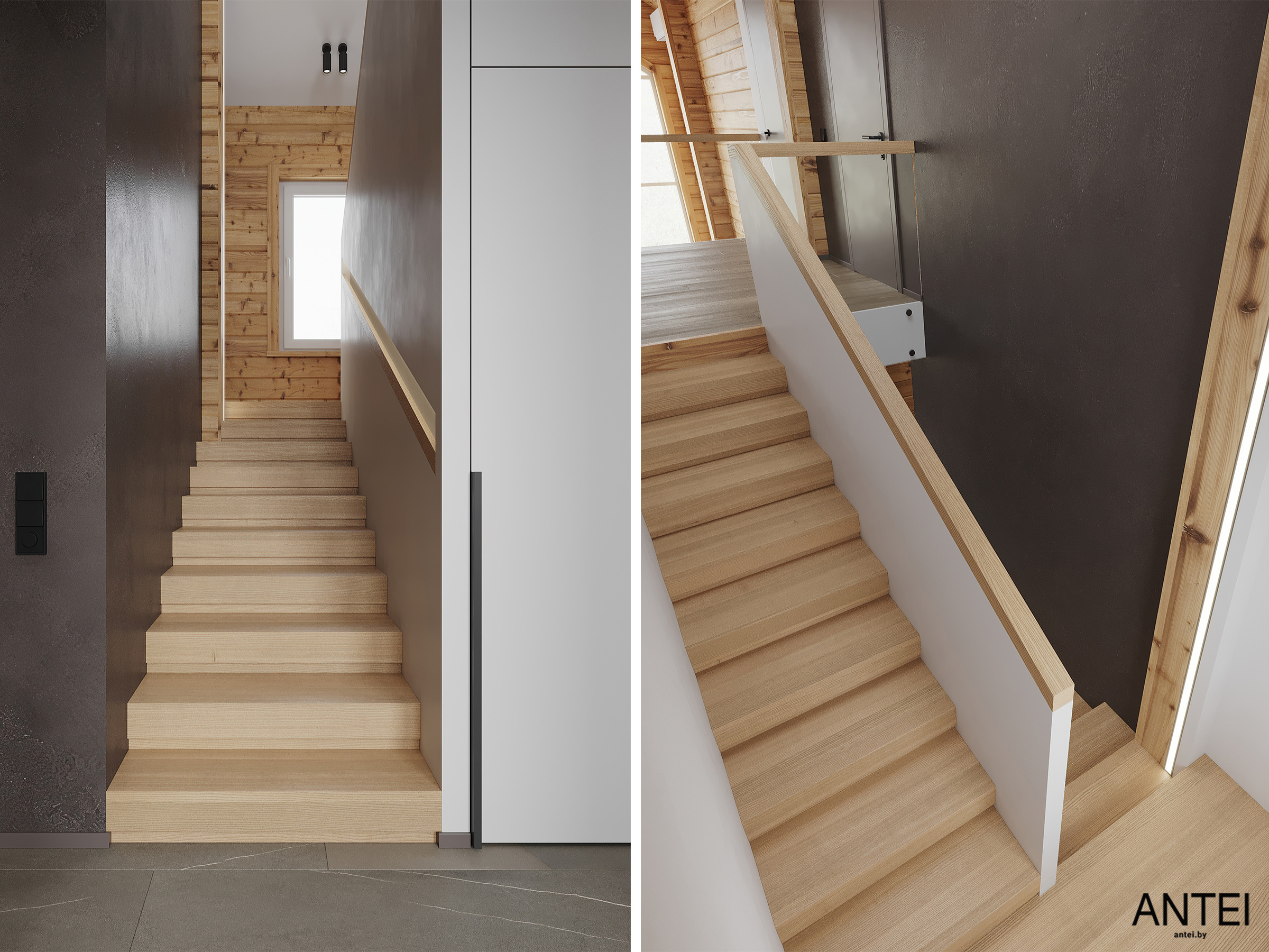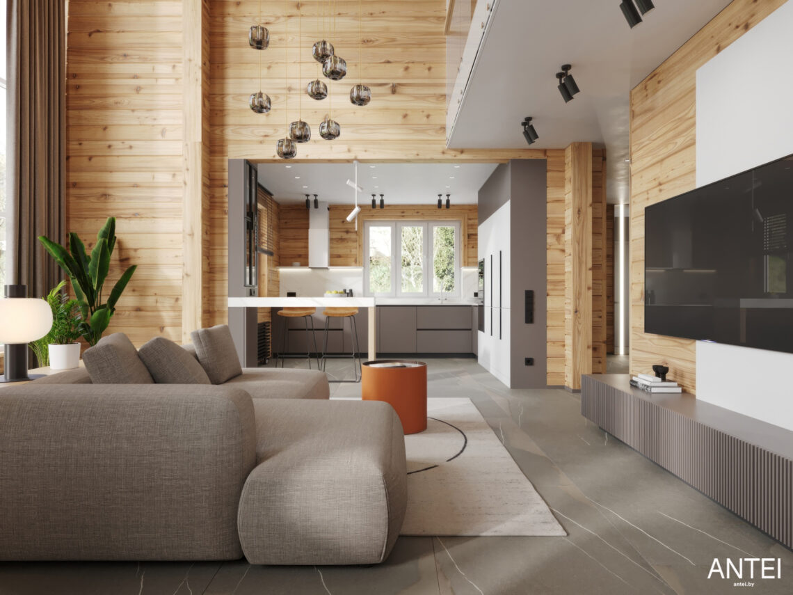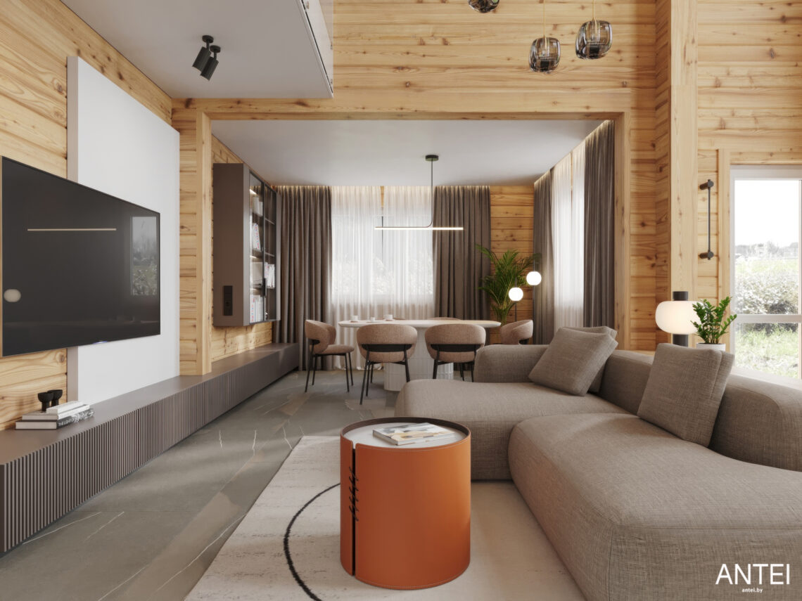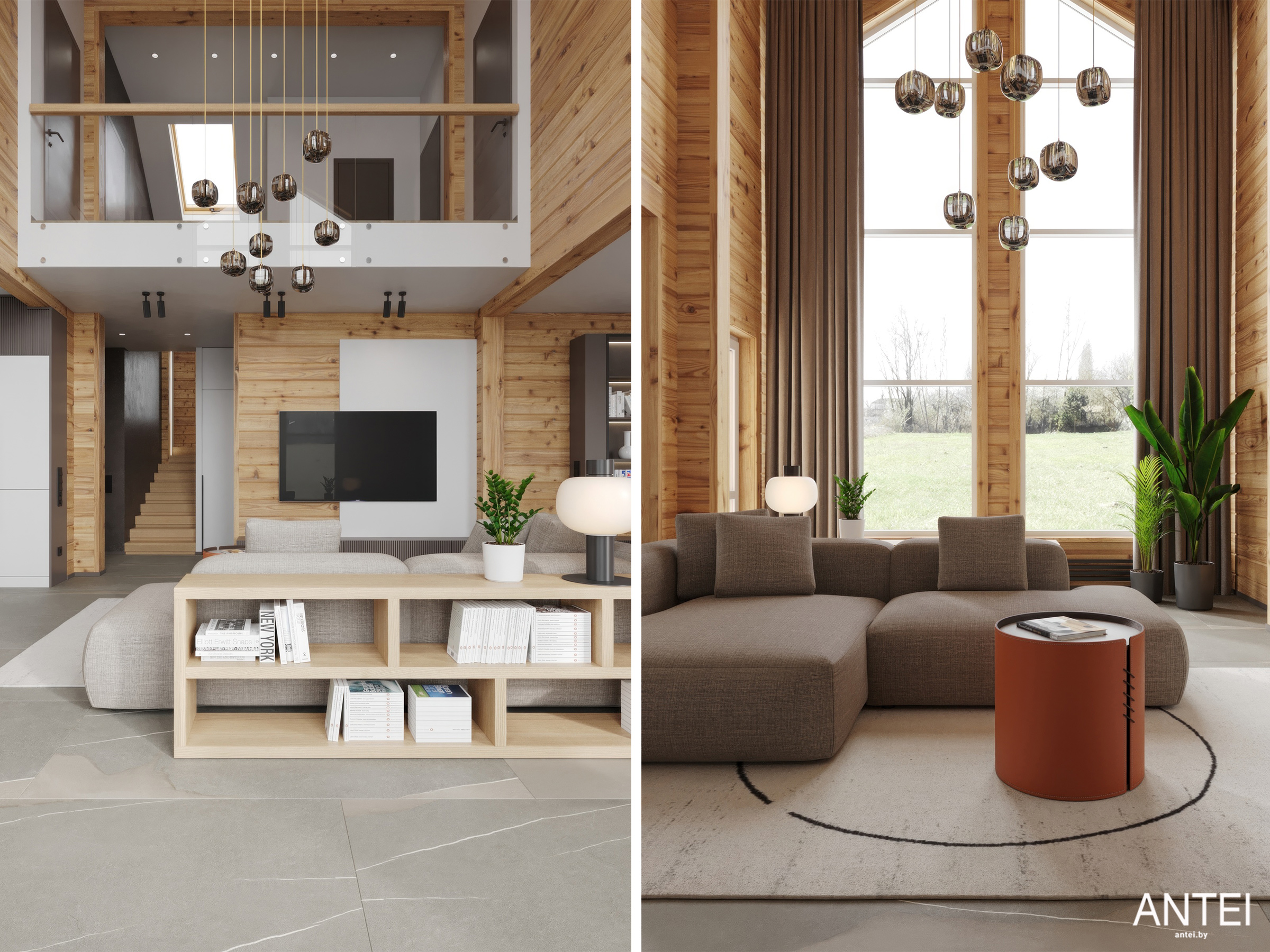 Интерьер дома из бруса в Московской областиСовременный дизайн интерьера дома из бруса со вторым светом, площадью 195,0 кв.м. в Московской области