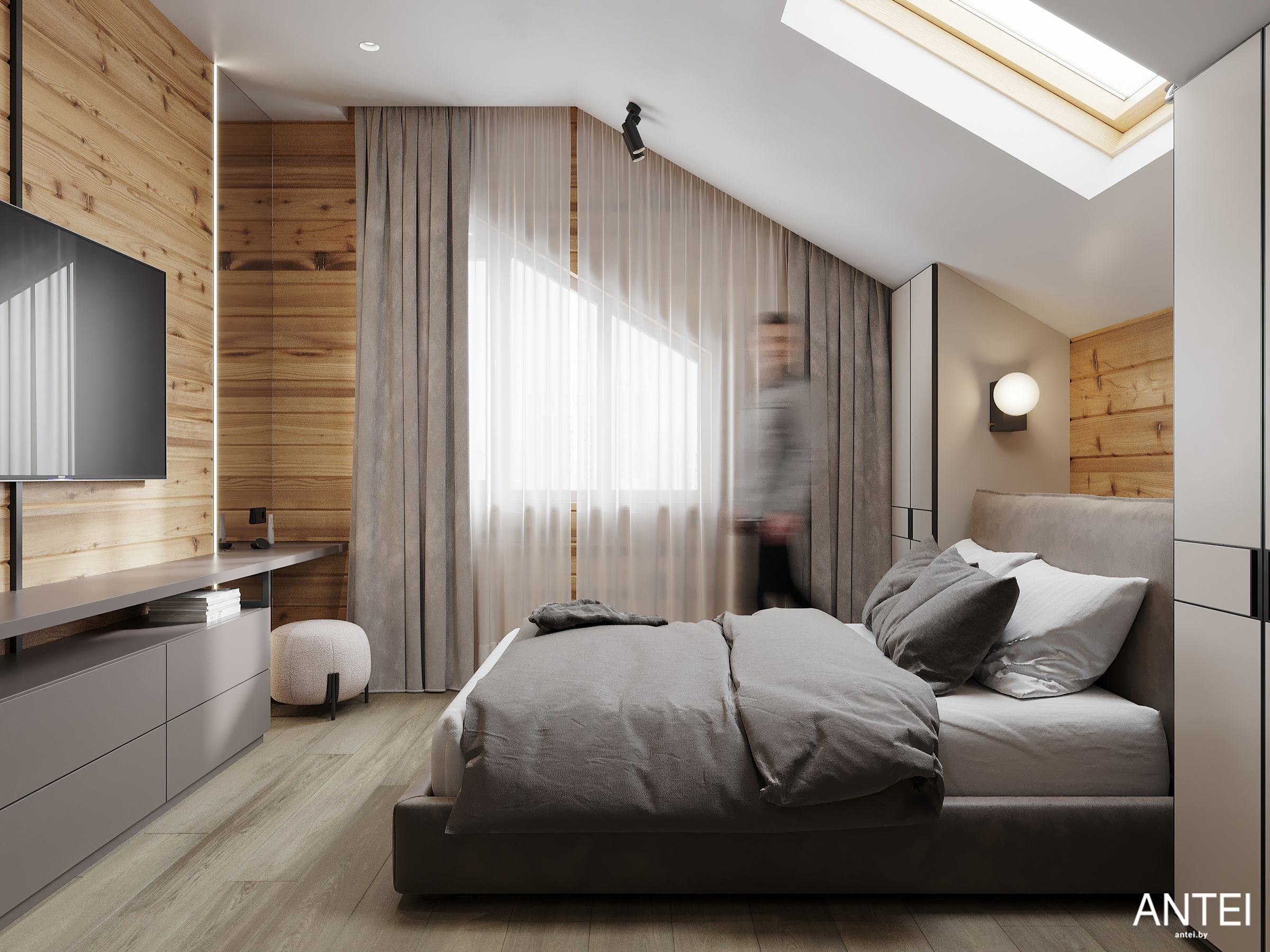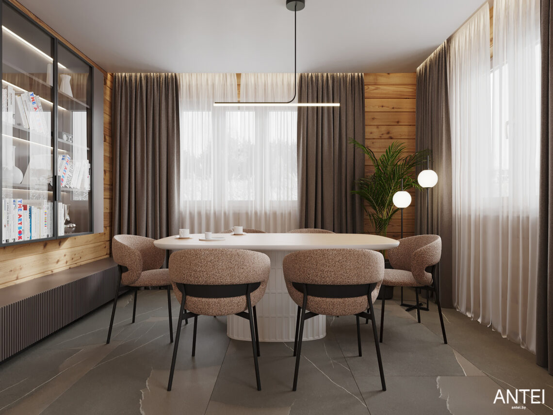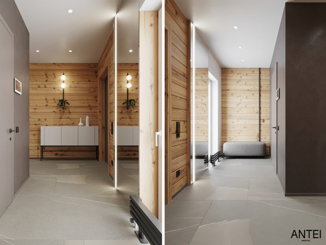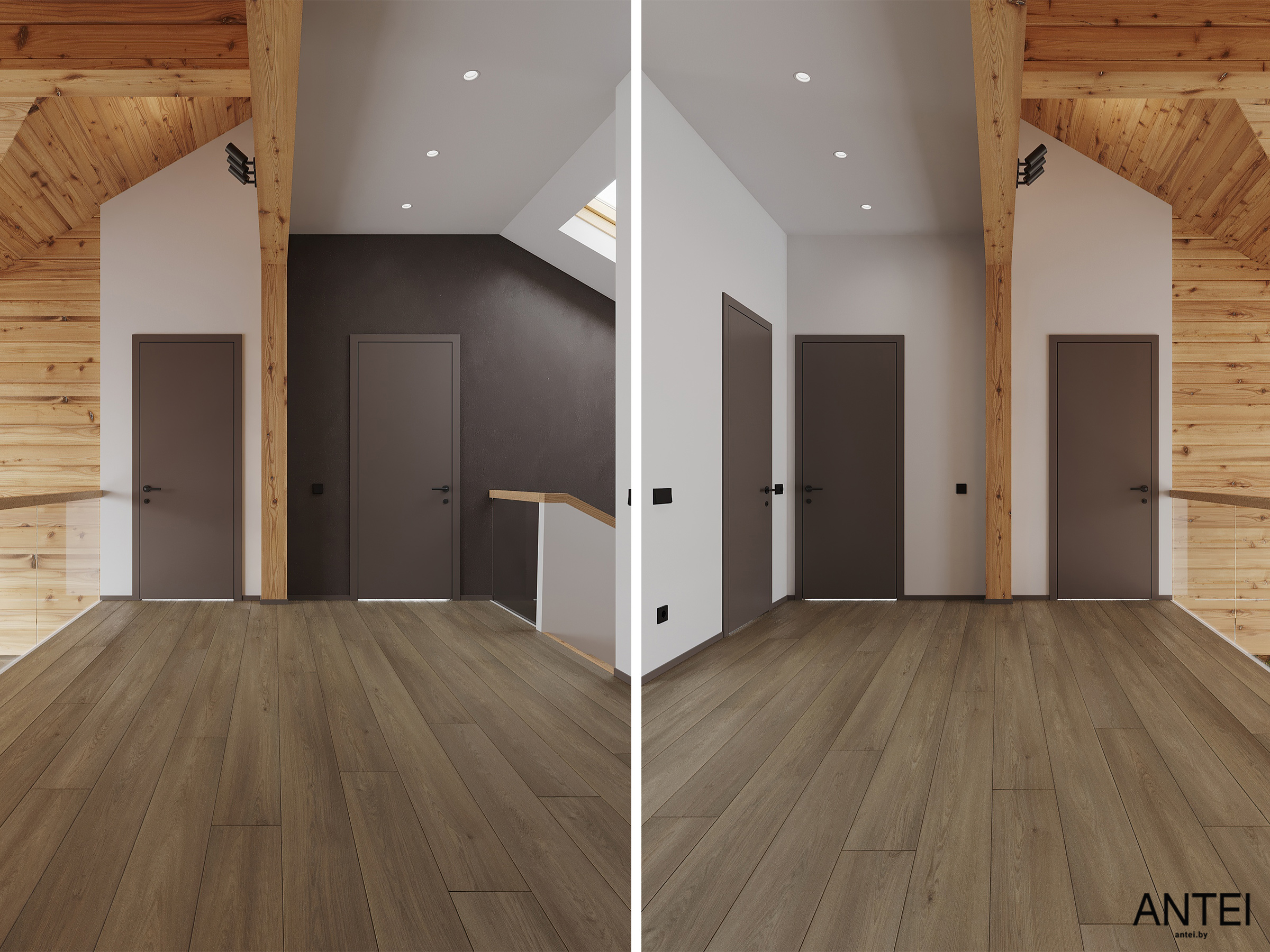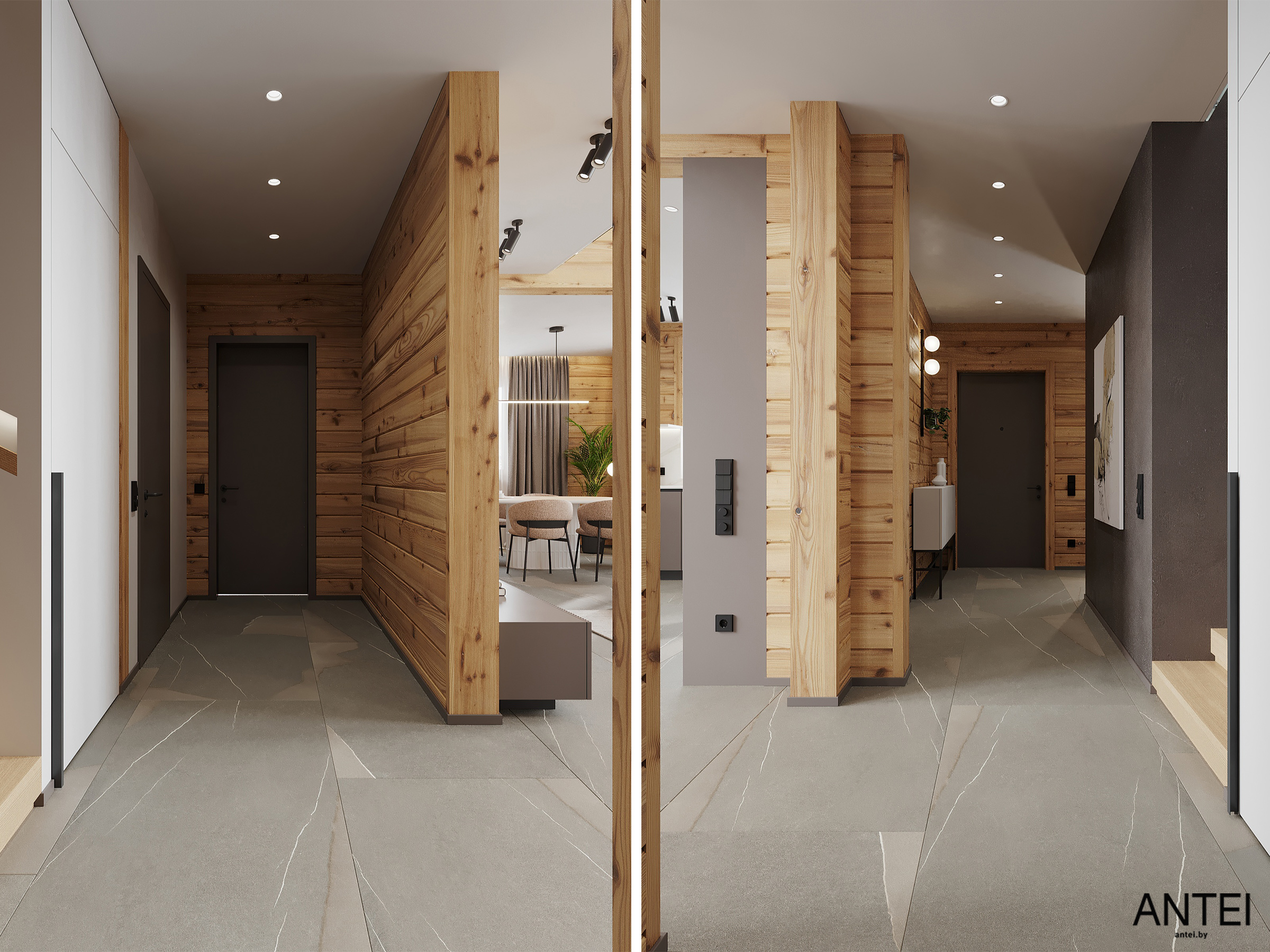 Интерьер дома из бруса в Московской областиСовременный дизайн интерьера дома из бруса со вторым светом, площадью 195,0 кв.м. в Московской области